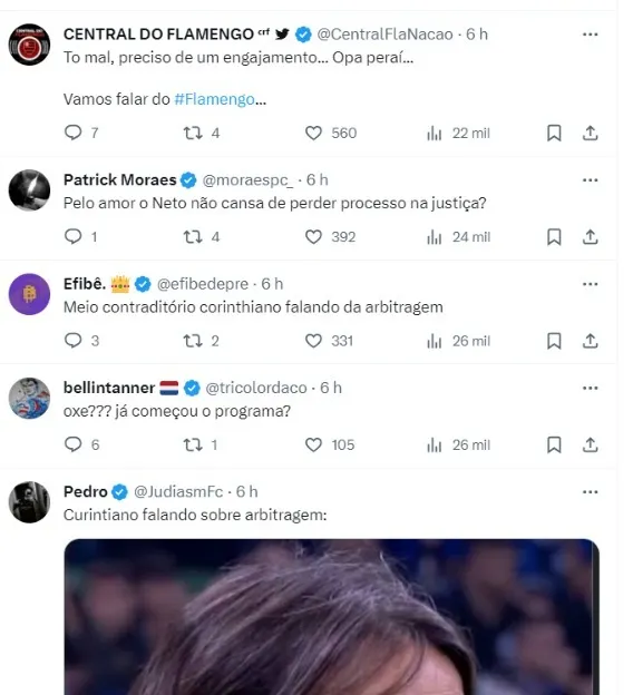 “O Flamengo sempre ganha do Atlético-MG, porque os caras sempre quebram o Atlético-MG na arbitragem. Desde antes de Cristo, o que o Flamengo faz com o Atlético-MG… O Flamengo sempre fez mal ao Atlético-MG na arbitragem. Se fizer de novo, aí tem que parar o campeonato”, disse Neto, no “Apito Final”.