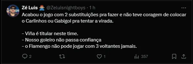 O atacante, que marcou o gol de empate do Flamengo, mostrou insatisfação com o desempenho do grupo de arbitragem. Até o momento, Bruno Henrique foi o único atleta que falou para a mídia.