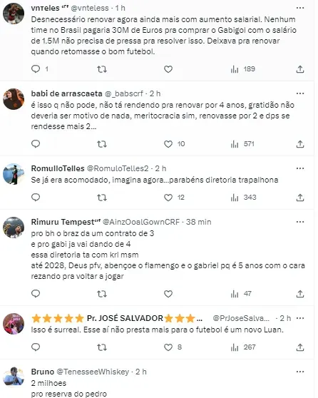“O Gabigol deve ter seu contrato renovado em breve, por quatro anos, com ajuste salarial. O Flamengo não estipula teto de salário, mas a grana tem que caber no orçamento. O primeiro dígito no salário do Gabriel deve mudar”, concluiu Mauro Cezar.