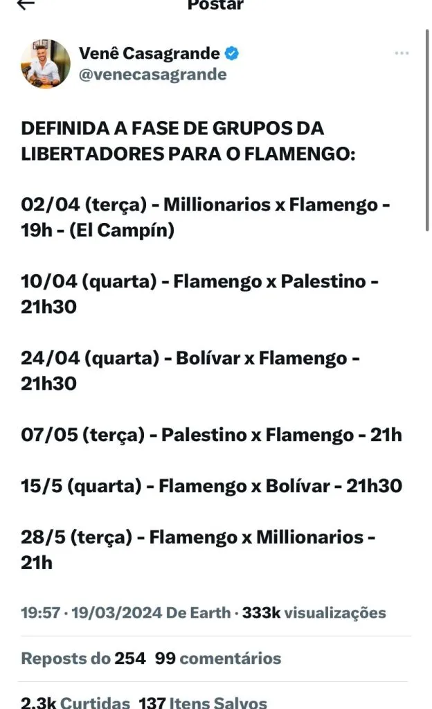 O Flamengo já sabe qual será de início o seu caminho pela ‘Glória Eterna’ na Libertadores. O time carioca é cabeça-chave do Grupo E do maior torneio sul-americano, com isso, ele irá enfrentar o Millonarios, da Colômbia, Bolívar, da Bolívia e Palestino do Chile.