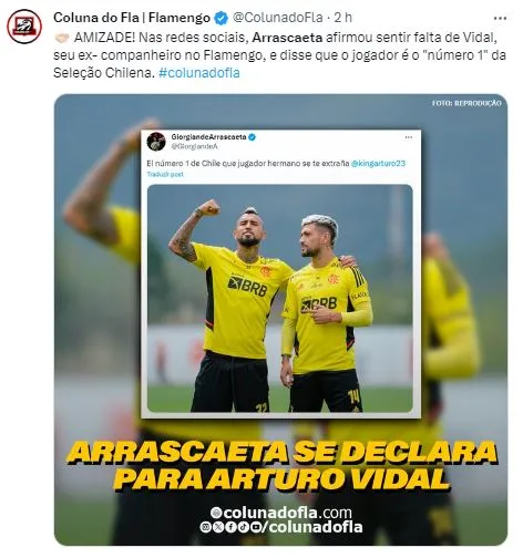 Arrascaeta usou suas redes sociais para mandar um recado para o chileno Arturo Vidal, que atualmente está no Athletico-PR. O camisa 14 da Gávea não poupou palavras para expressar o sentimento que nutre pelo ex-companheiro.