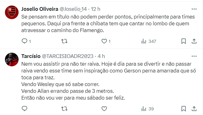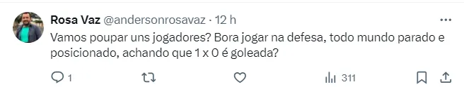 Segundo Milton, o Rubro-Negro perderá o jogo e praticamente selará a saída de Tite do Clube. “Bragantino 2 x 0 Flamengo. O time da Terra da Linguiça colocará Tite com um pé para fora do Rubro-Negro”, escreveu o ex-apresentador do Terceiro Tempo.