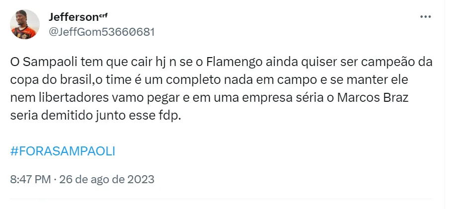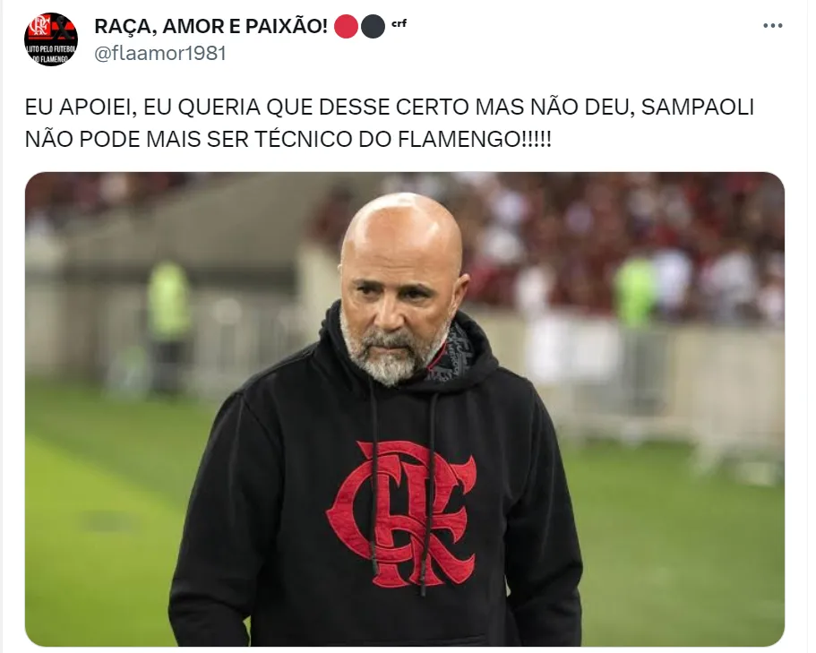 Nas redes sociais, a Nação Rubro-Negra acredita que o treinador argentino faz hora-extra no Clube Carioca e já deveria ter sido demitido. A avaliação que o profissional de 63 anos perdeu o grupo após o episódio da agressão sofrida pelo atacante Pedro do preparador físico Pablo Fernández, que fazia parte da comissão técnica de Sampaoli na época.