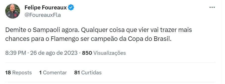 Para o lugar de Sampaoli, torcedores do Flamengo pedem a contratação de Tite, que comandou a Seleção Brasileira na Copa do Mundo do Catar e está livre no mercado. Os Rubro-Negros acreditam que o treinador ex-Corinthians tem o estilo ‘paizão’, perfil ideal para comandar o time da Gávea neste momento. O empate com o Inter foi a gota d’água para os flamenguistas.