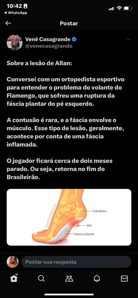 Indo mais afundo, o jornalista Venê Casagrande trouxe à tona mais detalhadamente, ele afirmou que conversou com um ortopedias esportivo e a contusão de Allan é considerada rara: “A contusão é rara, e a fáscia envolve o músculo. Esse tipo de lesão, geralmente, acontece por conta de uma fáscia inflamada. O jogador ficará cerca de dois meses parado. Ou seja, retorna no fim do Brasileirão”, disse o jornalista através de seu Twitter.