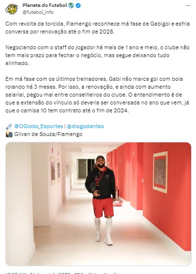 Diogo Dantas informou que a pressão da torcida flamenguista fez com que as conversas pela renovação fossem paradas e esfriassem novamente. A ideia é manter ele até 2028 e as ideias já estão alinhadas entre as partes, mas o acordo pode e deve ser encaminhado apenas no ano que vem.