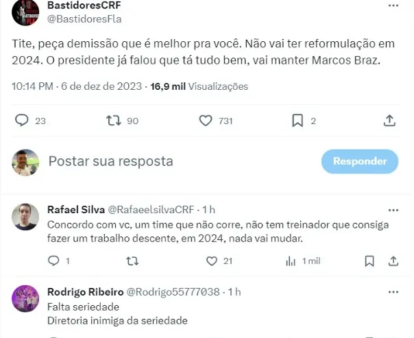 “Tite, peça demissão que é melhor pra você. Não vai ter reformulação em 2024. O presidente já falou que tá tudo bem, vai manter Marcos Braz”.