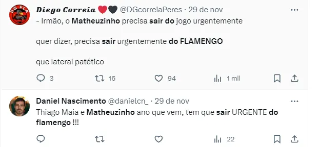 Ainda conforme Raisa Simplicio, Matheuzinho e Wesley podem ser negociados caso chegue uma proposta na próxima janela de transferências. Vale destacar que Matheuzinho é muito contestado e criticado pela Nação e a torcida já pediu a saída do defensor durante o ano.