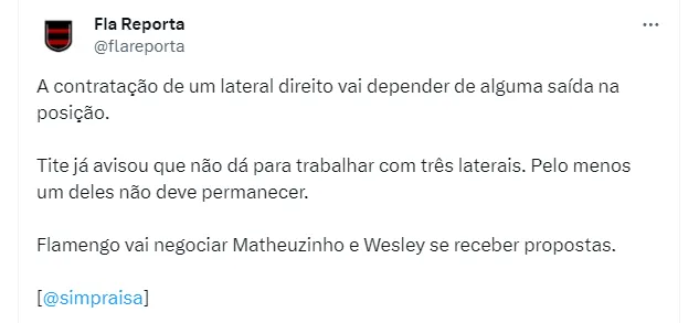 Segundo informações apuradas por Raisa Simplicio, Tite já teria comunicado a direção do Mengão que não quer trabalhar com três laterais para a mesma posição. Com isso, um dos laterais-direitos do Fla não deve ficar em 2024.