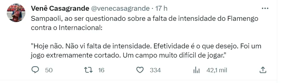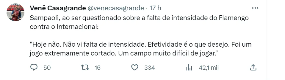 Sampaoli acabou, inclusive, citando o São Paulo de Dorival Júnior para justificar seu ponto: “Não concordo (sobre a passividade). Em outros jogos, sim, mas hoje não. Se for falar de contexto e comparações com nossas partidas com São Paulo ou América-MG, hoje não vejo que falte intensidade, intenção ou desejo. Tivemos capacidade de definir o jogo e se conseguíssemos, teríamos a vantagem porque o adversário não chutou a gol. Hoje tivemos um jogo picado e com campo difícil de jogar”, disse.