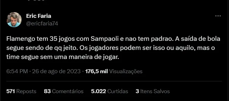 Vale destacar que existe uma pressão interna e externa para a demissão de Jorge Sampaoli. Dentro do próprio Clube, inclusive, Marcos Braz, vice de futebol, e o diretor Bruno Spindel chegaram a avaliar um processo de troca de comando, mas não vão contrariar a decisão de Landim. Já que o presidente entende que não tem sentido na troca de técnico antes do fim da temporada. Menos ainda, antes da decisão da Copa do Brasil.