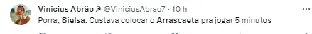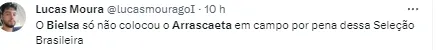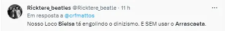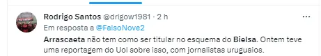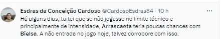 “Há alguns dias, tuitei que se não jogasse no limite técnico e principalmente de intensidade, Arrascaeta teria poucas chances com Bielsa. A não entrada no jogo hoje, talvez corrobore com isso”. “Bielsa também deixa o Arrascaeta no banco, tal qual o Óscar Tabárez, por aqui tratavam o Tabárez como um imbecil por fazer isso”, se manifestaram dois torcedores do Fla.