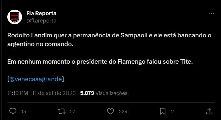 Apesar do desempenho inconstante em campo, o presidente Rodolfo Landim gosta do trabalho de Sampaoli e quer a permanência do argentino no comando da equipe para a próxima temporada. De acordo com informações do jornalista Venê Casagrande, em nenhum momento o mandatário cogitou a saída do técnico para a contratação de Tite.