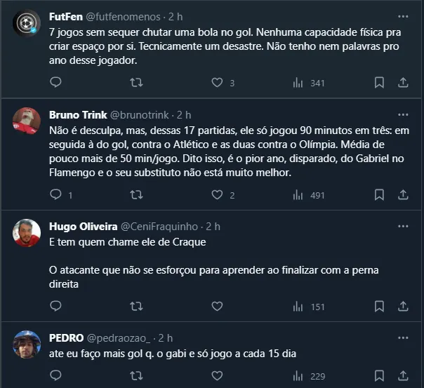 Foi justamente contra o Grêmio que Gabriel Barbosa marcou seu último gol com bola rolando pelo Fla, há exatos três meses. O tento saiu na vitória por 2 a 0 sobre o Tricolor Gaúcho, no jogo de ida das semifinais da Copa do Brasil. Na ocasião, o atleta ainda era titular, mas também não vivia um momento dos melhores. O próximo jogo será contra o Santos, daqui há uma semana.