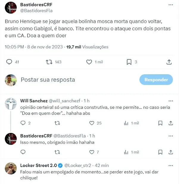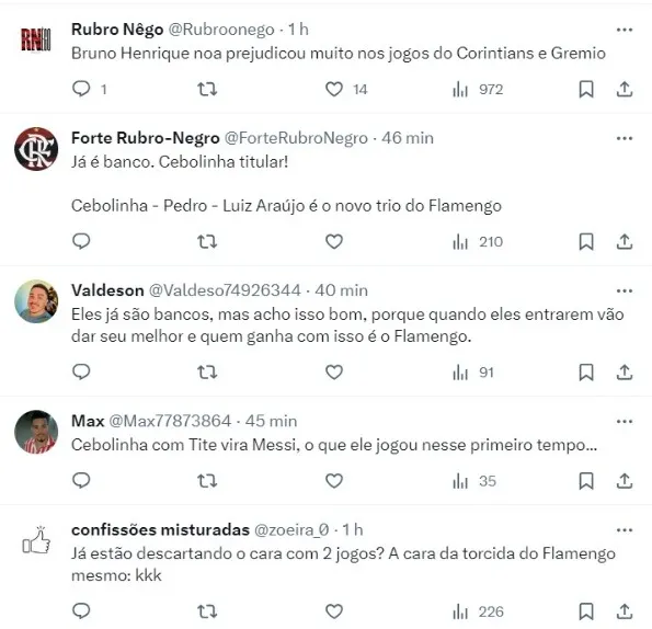 Para muitos torcedores, Tite achou o trio de ataque ideal, sendo Cebolinha, Luiz Araújo e Pedro. Ou seja, os flamenguistas hoje encaram que Gabigol e Bruno Henrique se tornaram reservas pelo rendimento em 2023. Confira alguns comentários (SIC).