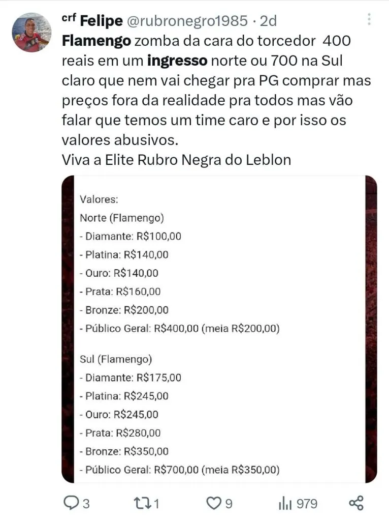 O bilhete mais barato para quem não é sócio do clube para a partida contra o São Paulo, pela final da Copa do Brasil, no Maracanã, custa R$ 400. Diante da situação, o jornalista Renato Mauricio Prado (RMP), afirmou que o Clube demonstrou não se importar com o seu torcedor. “A sensação que eu tenho é que essa diretoria do Flamengo não está nem aí para o torcedor. Na verdade, ela percebeu já que, ainda mais com as conquistas dos últimos anos, ela tem um número considerável de rubro-negros com grana para encher o Maracanã independente do preço que eles colocam.”, avaliou durante o podcast Uol News Esporte.