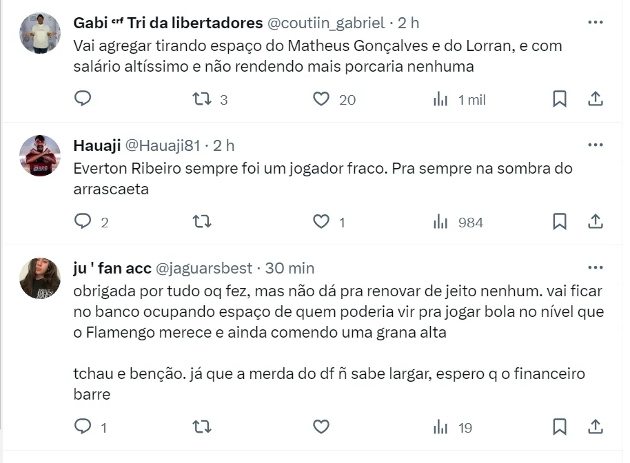 Essa notícia do desejo do Mengão em renovar com Everton Ribeiro não caiu bem com a Nação. Os torcedores flamenguistas acreditam que o ciclo do meia de 34 anos no Clube Carioca chegou ao fim.