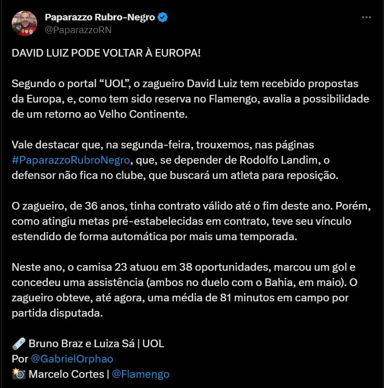 Dentre os nomes cotados para deixar a equipe está o do zagueiro David Luiz. O defensor não vem conseguindo apresentar um desempenho seguro em campo e, atualmente, não aparece como a melhor opção para o setor. Vale destacar, inclusive, que o atleta está ciente da situação e vem avaliando a possibilidade de retornar à Europa. Aos 36 anos, o zagueiro tem vínculo até o final da temporada, mas diante de metas pré-estabelecidas em contrato, acabou sendo estendido por mais um ano.