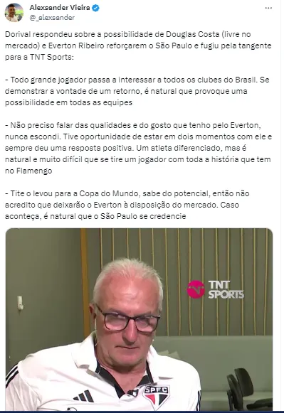 “Tite o levou para a Copa do Mundo, sabe do potencial, então não acredito que deixarão o Everton à disposição do mercado. Caso aconteça, é natural que o São Paulo se credencie”, finalizou Dorival, destacando que ele deve permanecer no Rubro-Negro Carioca.