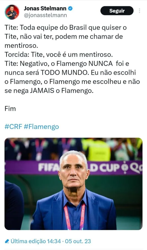 Para o Rodrigo Bueno, Tite já chega ao Flamengo sob uma percepção ruim. Isso porque o treinador havia afirmado que não treinaria nenhuma equipe brasileira em 2023. O treinador, inclusive, rejeitou comandar o Corinthians, seu ex-clube, garantindo que não quebraria seu ano sabático por nenhuma equipe do futebol brasileiro. “Cabe a mim chamar o Tite de mentiroso. Ele já chega no Flamengo como mentiroso”, declarou durante participação no F90.