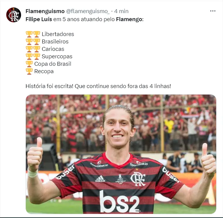 O lateral vai utilizar a partida entre Flamengo e Cuiabá, marcada para o próximo domingo (3), para se despedir e terá uma tarde de homenagens. Filipe terá todas as taças que conquistou com o manto Rubro-Negro expostas no gramado do Maracanã.