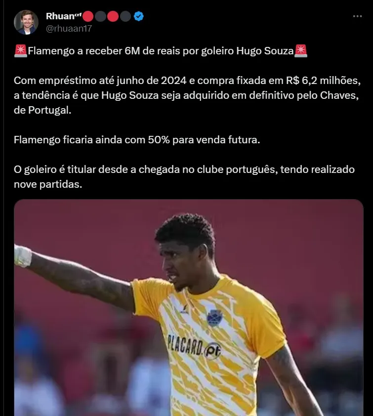 Com isso, alguns jogadores já estão com o futuro definido, seja para permanência ou saída do Flamengo no próximo ano. E de acordo com o portal ESPN, o goleiro Hugo Souza já definiu o seu futuro em 2024. Emprestado ao Chaves, de Portugal, após oscilação na equipe carioca que o fez perder espaço e se tornar terceira opção para a posição, o jogador vem se destacando. Desde que chegou ao Clube assumiu a titularidade, de onde não saiu.