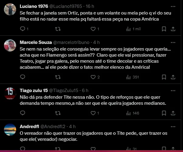 De acordo com o jornalista Julio Miguel Neto, Tite está incomodado com a falta de reforços do Flamengo para a temporada. Até o momento, apenas o meia Nicolás de La Cruz chegou para o elenco.