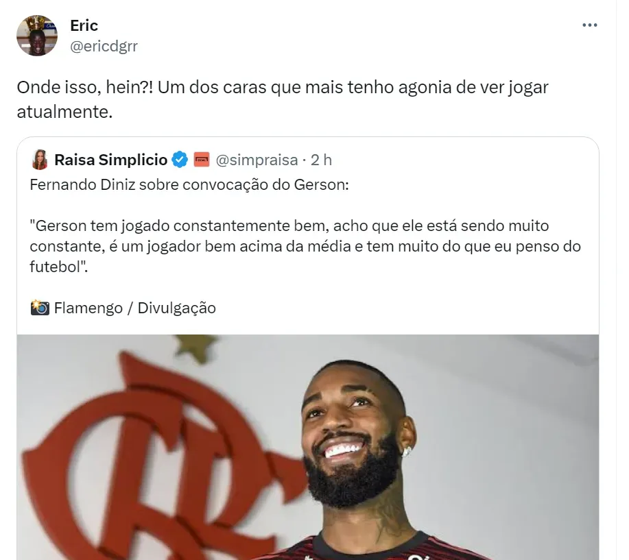 “Nem ele acredita nisso. O Gerson não está jogando nada. Que po*** é essa”, disse um torcedor do Flamengo. “Pô, ele não mentiu, joga mal todas as partidas! Regularidade”, ironizou outro flamenguista no Twitter. “Vai voltar mais bagre do que está sendo (vide Pedro e Everton Ribeiro)”, lamentou mais um torcedor do Mengão. Bastante criticado pela torcida, Gerson deve ser titular neste domingo (24), no Morumbi.