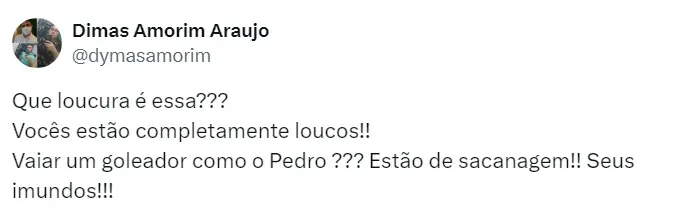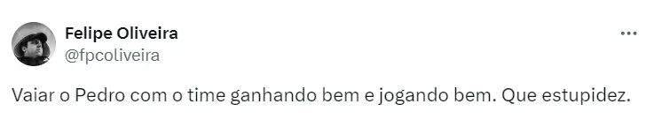 “Parabéns à torcida do Flamengo. Torcida terceirizada, né? Vocês xingando o Pedro. O Pedro joga em qualquer time do mundo. E vocês maltratando o Pedro e agora puxando o saco do Gabigol. Pedro, o Flamengo não te merece, filho”, disse Neto.