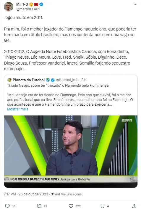 “Meu desejo ali era de ter ficado no Flamengo. Foi o melhor ano (2011) profissional que eu tive. Em números, meu melhor ano foi no Flamengo. Aconteceu que o Flamengo tinha um prazo para exercer a minha compra junto ao Al Hilal, mas deixou passar. Nessa, entra o Celso Barros, que veio conversar comigo e perguntou: ‘E se eu entrar nesse negócio aí?’. Respondi que eu só não queria voltar para a Arábia, que se ele entrasse eu ia para o Fluminense. Aí o Fluminense foi lá e me comprou”, admitiu Thiago Neves à ESPN Brasil.