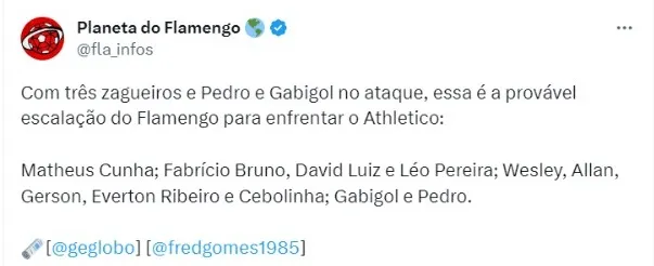 Com as ausências de Arrascaeta e Luiz Araújo, lesionados, o atacante deve ser opção para iniciar o jogo ao lado de Gabigol e Pedro, contra o Athletico-PR. Com três zagueiros e Pedro e Gabigol no ataque, essa é a provável escalação do Flamengo para enfrentar o Athletico: Matheus Cunha; Fabrício Bruno, David Luiz e Léo Pereira; Wesley, Allan, Gerson, Everton Ribeiro e Cebolinha; Gabigol e Pedro.