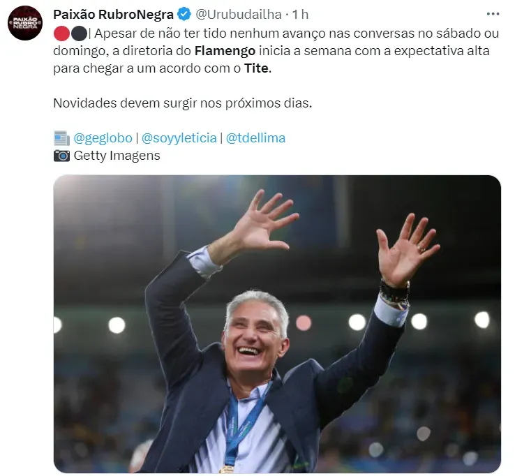 Desde a demissão do argentino Jorge Sampaoli, o Flamengo está em busca de um novo treinador. Tite, ex-técnico da Seleção Brasileira, é o nome favorito para assumir o cargo, e cada dia mais pessoas apoiam a possível escolha. E dessa vez, quem deu o seu palpite sobre a chegada do antigo comandante da amarelinha foi o narrador Galvão Bueno, torcedor assumido do Rubro-Negro.