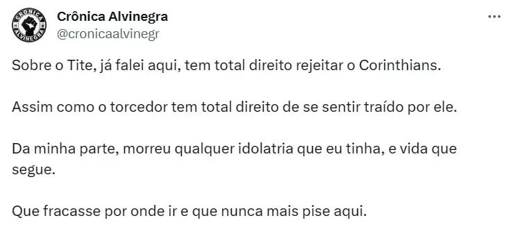 Além de acertar com um ‘rival’, o fato de Tite ter voltado atrás na decisão de assumir um time em 2023 também é muito comentado pelos paulistas. Só neste ano, o Corinthians tentou a contratação do técnico em quatro oportunidades – em todas ouviu que o profissional só assumiria uma equipe a partir de 2024.