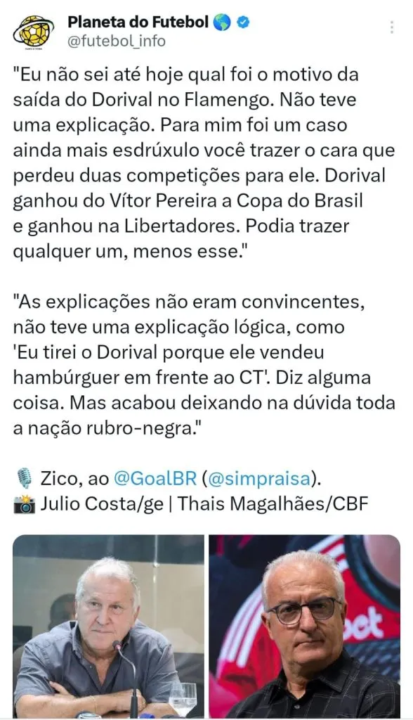 “Eu sou muito sincero com você. Penso muito mais no São Paulo do que própria e individualmente na figura do treinador, do Dorival, que no ano passado esteve no Flamengo. Só tive alegrias lá dentro, grandes momentos. Sou muito grato pela oportunidade que tive, nunca questionei a posição tomada, sempre respeitei, e não será nesse momento que vou mudar tudo o que disse a respeito da equipe em que estava”, afirmou Dorival Júnior.