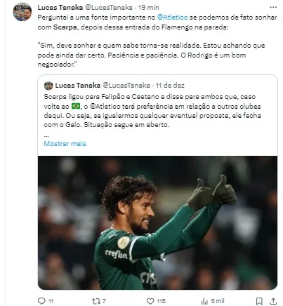 Apesar da vantagem do Flamengo, o Atlético Mineiro também está interessado em Gustavo Scarpa. Foi noticiado pela Itatiaia que o time mineiro ganhou uma ampla vantagem na negociação.