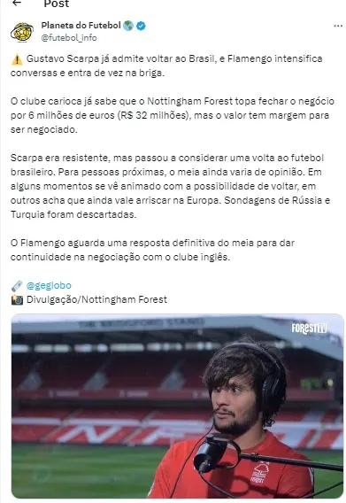 O Nottingham Forest espera receber ao menos cerca de 4,5 milhões de euros, cerca de R$ 24 milhões na cotação atual. Lembrando que há um mês atrás o Atlético havia desistido da negociação.