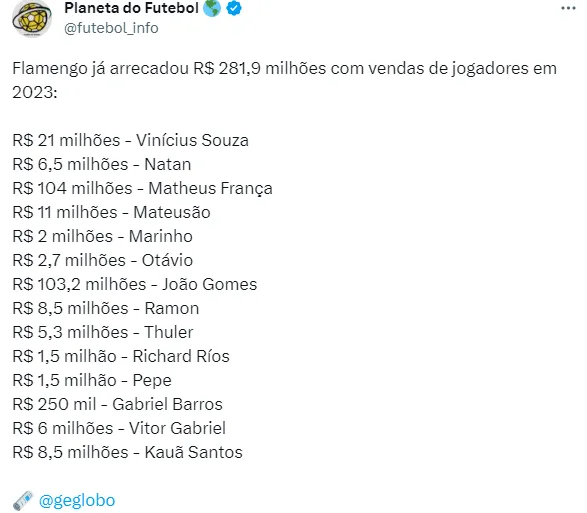Boa parte do valor foi graças a duas promessas. Trata-se de Matheus França e João Gomes, negociados com o futebol inglês. O Mengão sacramentou suas vendas por R$ 104 milhões e R$ 103,2 milhões. Vale destacar também o negócio feito com Vinícius Souza, em que a equipe recebeu R$ 21 milhões. As negociações com os outros 11 jogadores foram abaixo dos R$ 10 milhões.