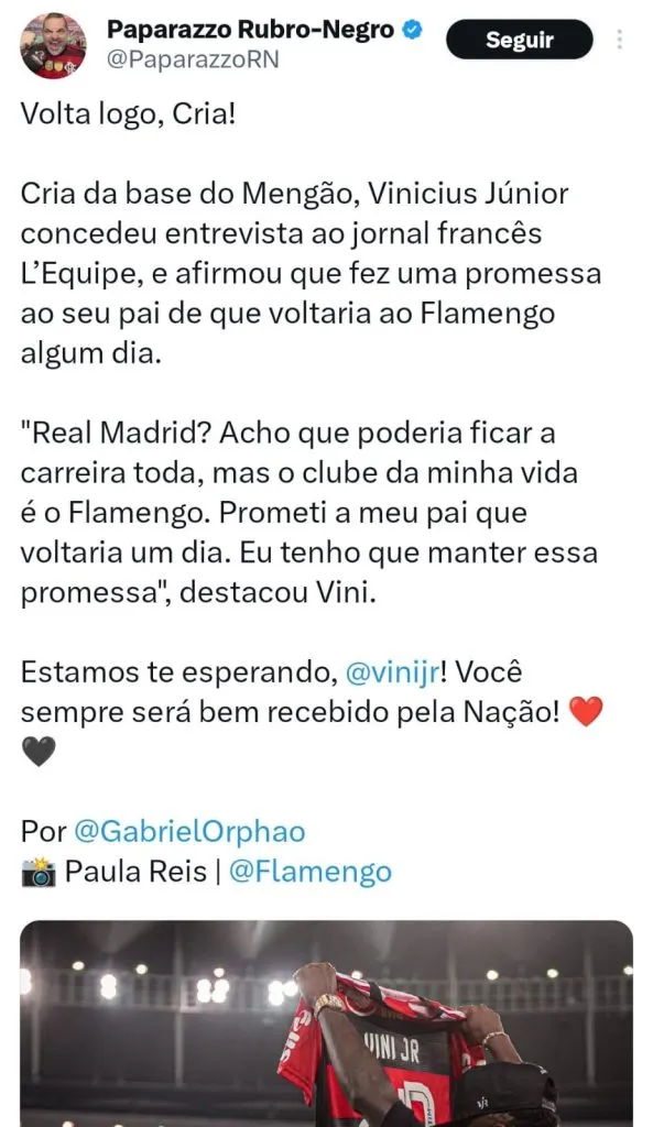 O amor de Vinicius Júnior pelo Flamengo se justifica pela própria história do atleta com o clube carioca. O jogador chegou à Gávea com menos de 11 anos, ascendendo ao profissional em 2017, defendendo o Mais Querido por duas temporadas, atuando em 69 jogos com 33 vitórias, 23 empates e 13 derrotas, com um total de 14 gols marcados.