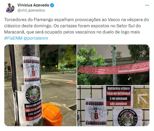 Torcedores do Rubro-Negro espalharam na noite de sábado (21), diversos cartazes no setor sul do Maracanã, que será ocupado pelos vascaínos no duelo de logo mais. Dentre às mensagens dos cartazes, a maioria se refere aos rebaixamentos do Vasco, com frases do tipo, “o seu destino é fracassar”. Confira os cartazes ao final da matéria.