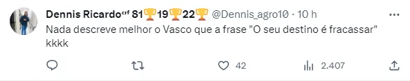 O rival do Flamengo está em uma luta feroz para fugir da zona do rebaixamento. Atualmente o Vasco é o primeiro na zona da degola, ocupando o 17º lugar com 30 pontos somados. A equipe de São Januário já foi rebaixada quatro vezes para a série B do Brasileirão, o que virou um festival de zombarias para os rivais na hora de provocar.