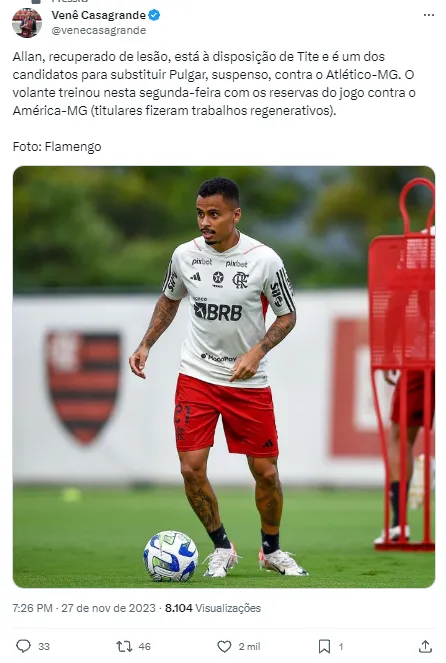 Recuperado da lesão no pé, o volante Allan estará à disposição de Tite para o jogo contra o Galo, no Maracanã. O jogador não entra em campo desde setembro, em duelo contra o Athletico-PR. Agora, o craque pode reencontrar sua ex-equipe.