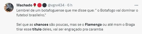 O empate do Botafogo contra o Athletico, e as duas vitórias seguidas do Flamengo sob o comando do técnico Tite, deram um gás para o elenco e para a torcida que voltaram a acreditar em um possível título do Brasileiro. Agora a diferença do líder Botafogo para o Mengão é de 9 pontos, com mais 10 rodadas do campeonato a serem disputadas.