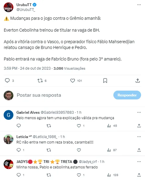 Além dos dois jogadores tão criticados pela Nação, essa é a oportunidade também para Tite embalar o Rubro-Negro. Faz tempo que esse grupo não vence por três jogos seguidos e um êxito contra um rival tão tradicional contra o Grêmio daria mais confiança ao elenco. De acordo com o GE, o Flamengo deve ser escalado da seguinte forma: Rossi, Wesley, Pablo, Léo Pereira e Ayrton Lucas; Thiago Maia, Pulgar, Gerson e Arrascaeta; Everton Cebolinha (Bruno Henrique) e Pedro.