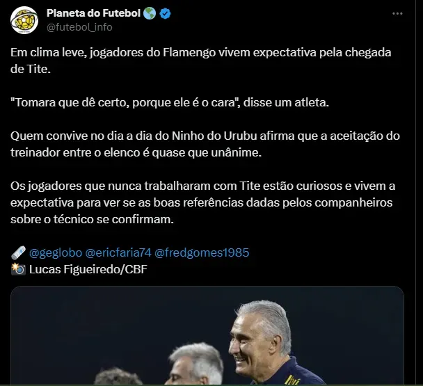 A expectativa é que Tite chegue ao Rubro-Negro durante a pausa para a Data-Fifa na próxima semana. O intervalo de jogos é visto como importante para a comissão do treinador e diretoria do Flamengo para mostrar os métodos para o elenco e iniciar os treinamentos. Depois do Corinthians, o Fla enfrenta o Cruzeiro, na segunda-feira (19), pelo Brasileirão.