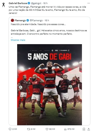 Ainda sem renovar, com a desistência do Corinthians anunciada no último final de semana, a parceria entre Gabriel Barbosa e Flamengo chegou aos cinco anos, cinco anos de muita glória e sintonia.
