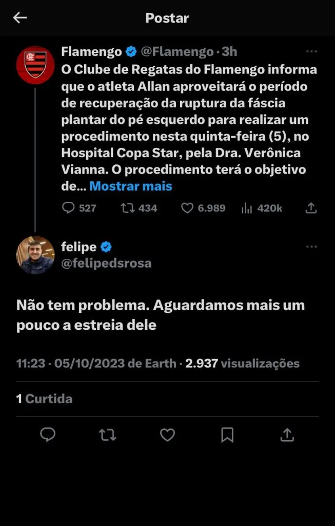 Lesionado, o volante Allan terá que passar por processo cirúrgico: (SIC) “O Clube de Regatas do Flamengo informa que o atleta Allan aproveitará o período de recuperação da ruptura da fáscia plantar do pé esquerdo para realizar um procedimento nesta quinta-feira (5), no Hospital Copa Star, pela Dra. Verônica Vianna. O procedimento terá o objetivo de retirar uma calcificação óssea no tornozelo direito”, disse o Clube em postagem.