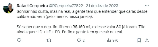 No entanto, alguns mostraram pessimismo e disseram que a negociação não vai acontecer: “Os caras colocam um monte de loucura na cabeça e depois se frustram”, disse um. Outro, também não mostrou confiança: “Infelizmente quase impossível, Dybala tem muito mercado na Europa ainda”, afirmou.