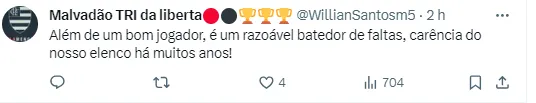 Em contrapartida houve quem se mostrou contrário: “Cinco anos de Palmeiras…Jogou bem apenas um”, criticou um torcedor. Outro foi na mesma linha: “Não é do nível que precisa. Só digo isso”, acrescentou outro. Por fim um usuário foi bem enfático: “Não é possível que o Flamengo fará essa m**”, completou.