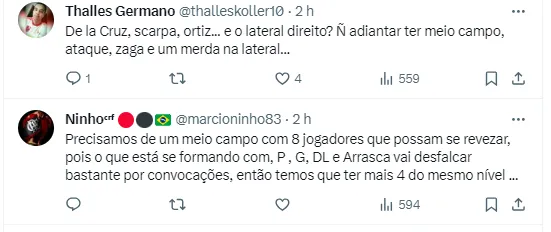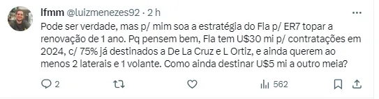 Pelo Twitter, houve quem se mostrou totalmente a favor da contratação: “Já tô iludido”, disse um. Outra internauta foi na mesma linha: “Primeira Observação: o preço a ser pago é excelente! Segunda: jogadores ‘crias’ do Fluminense sempre dão certo no Flamengo. Já estou iludida, aprova aí, Landim!”.