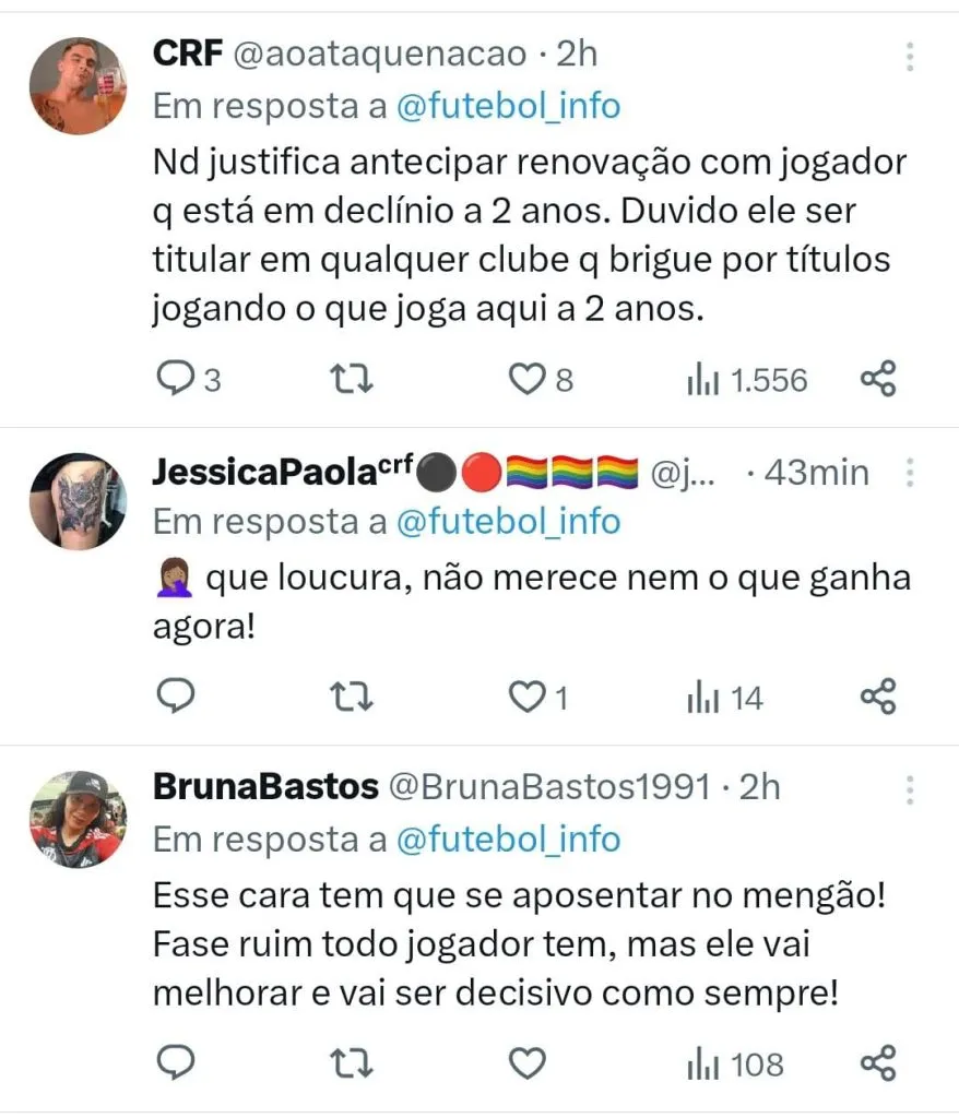 “Essa é a diretoria amadora do clube de regatas do Flamengo, nada me surpreende.”, disparou outro. “Loucura total, renovar contrato (q ainda nem venceu) por mais 4 anos e com jogador em má fase há uns 3 anos.”, disse um internauta também se mostrando contrário a renovação.